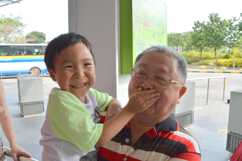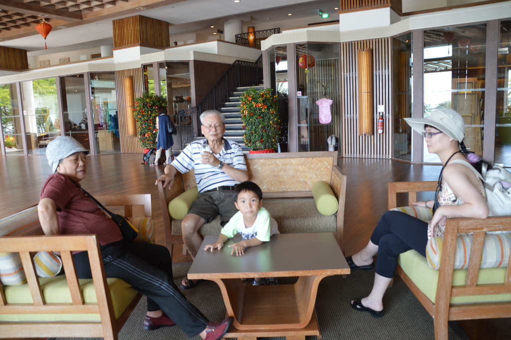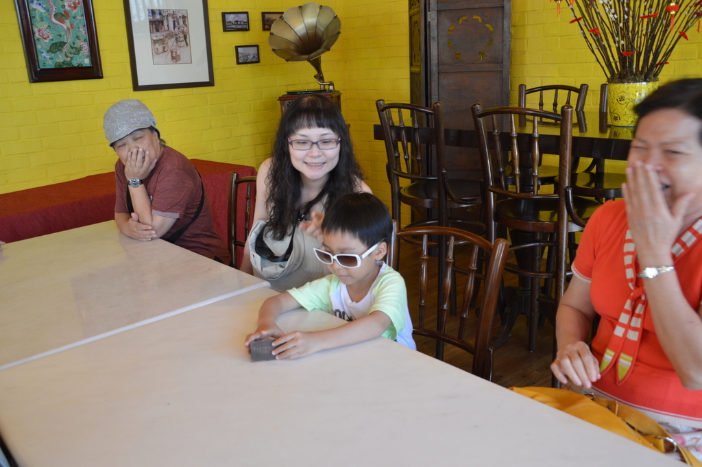 在飯店內的麵店用午餐, 我老媽笑到不行, 因為小蒲戴了我的太陽眼鏡, 說: "咦? 怎麼天黑黑!"
