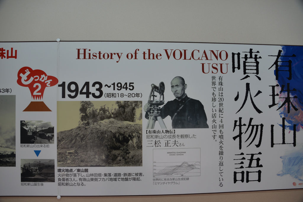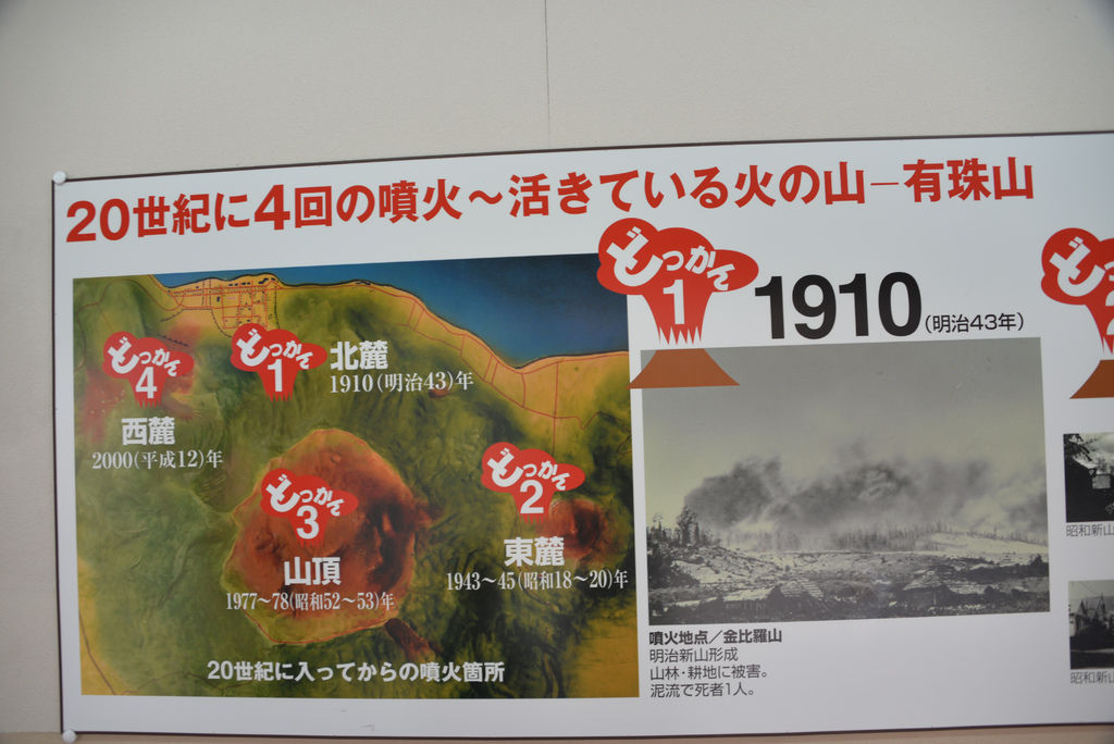 纜車處陳列的的有珠山噴發歷史介紹圖片。昭和新山是在第二次噴發後產生。