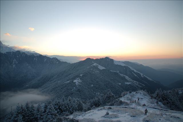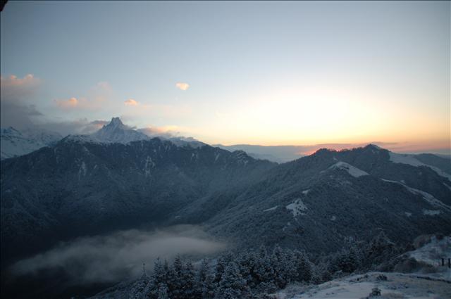 淡黃光線印上白雪山峰 更增添群峰的美麗