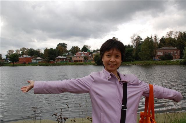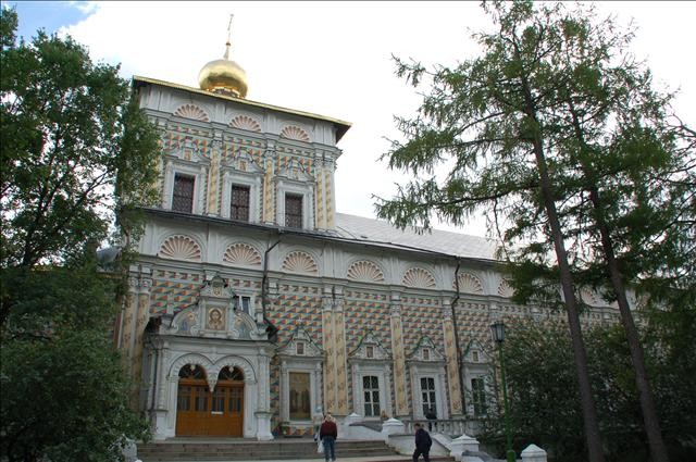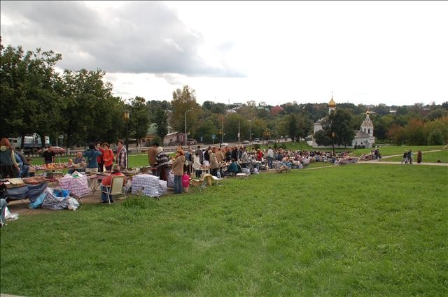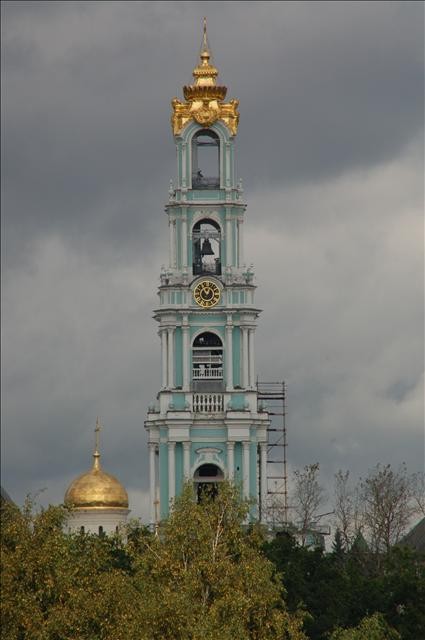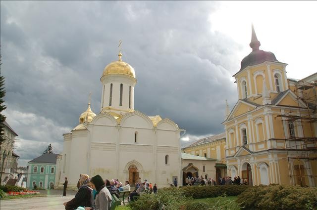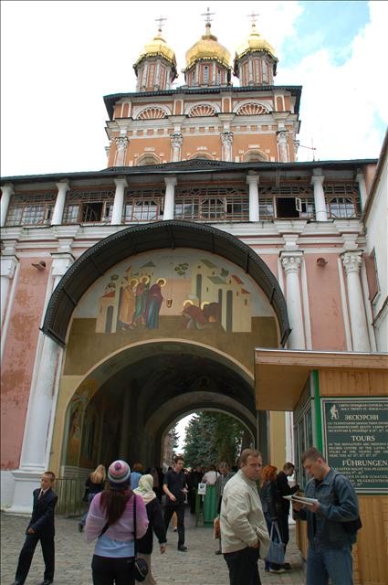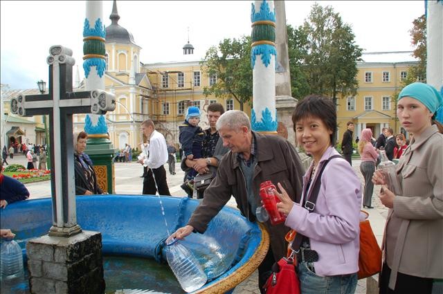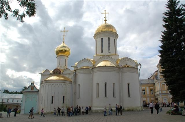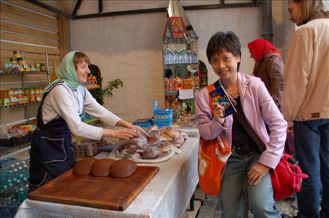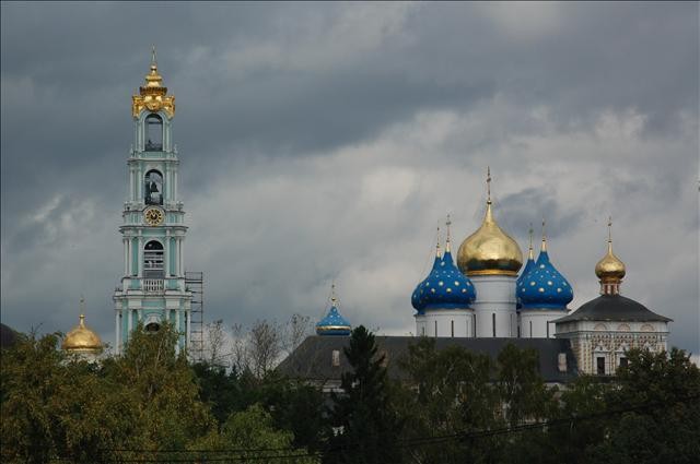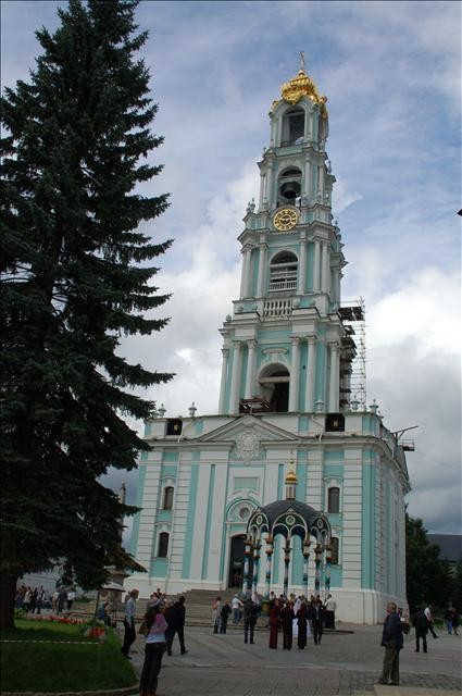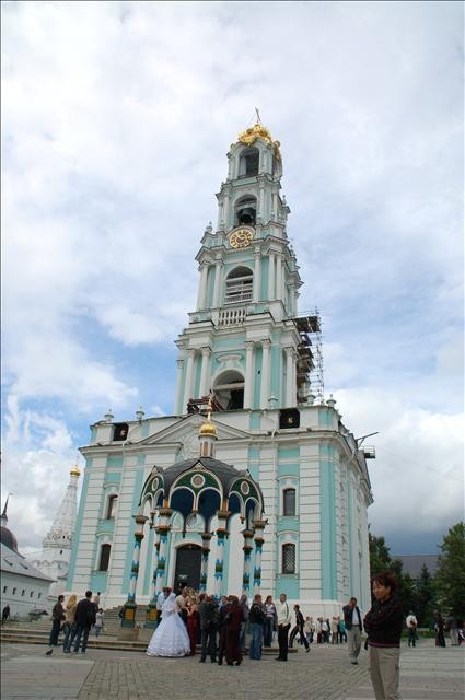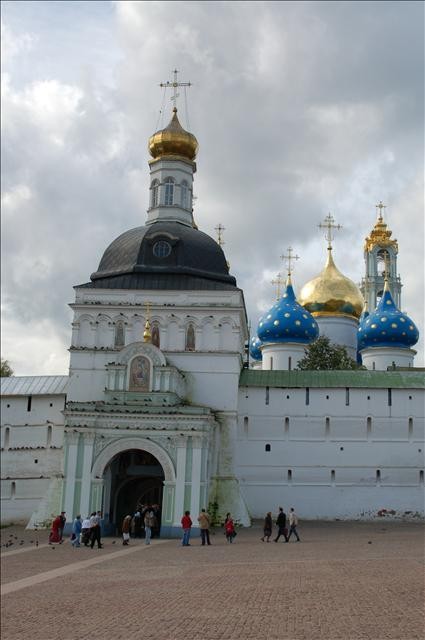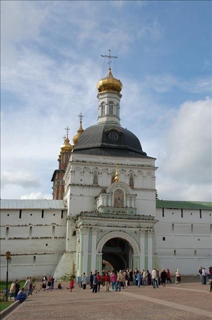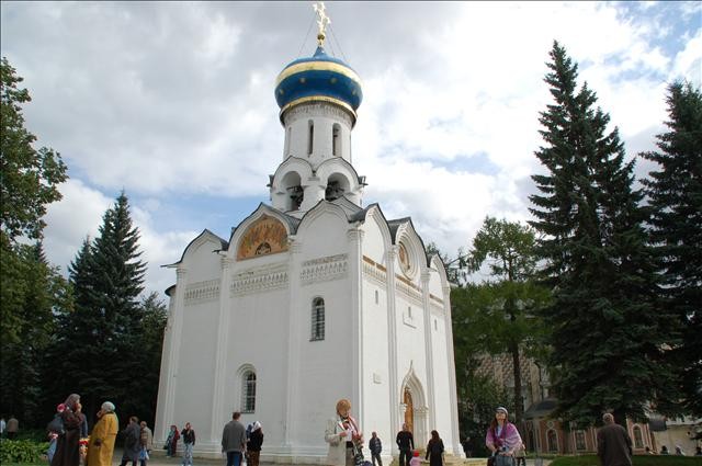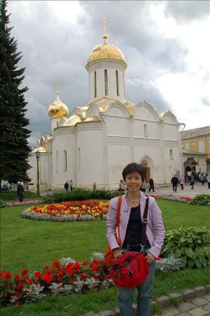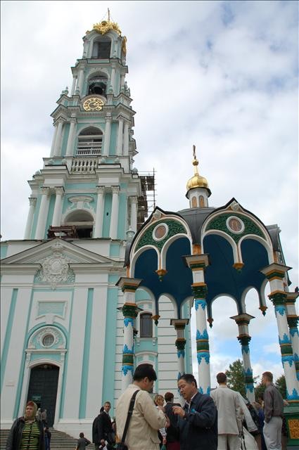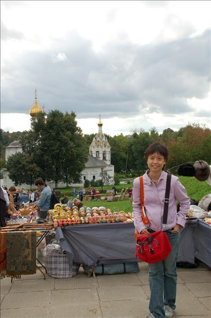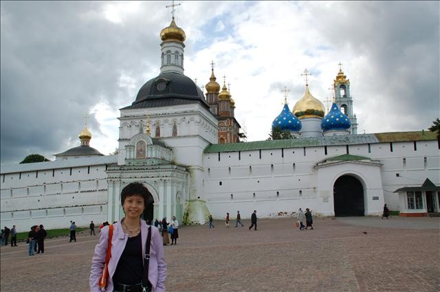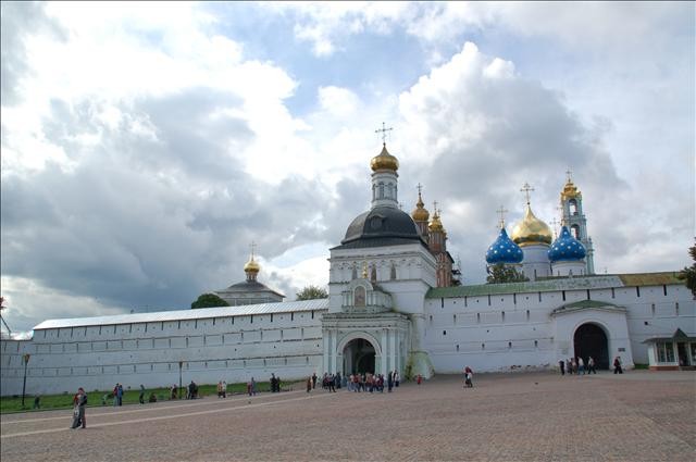從莫斯科Yaroslavsky火車站,搭到Siergive Posad。天氣很棒,天空晴朗有點雲朵,陽光灑落很舒服,信步逛到三一修道院附近。修道院前有很多攤販擺攤,一夥人逛的不亦樂乎。